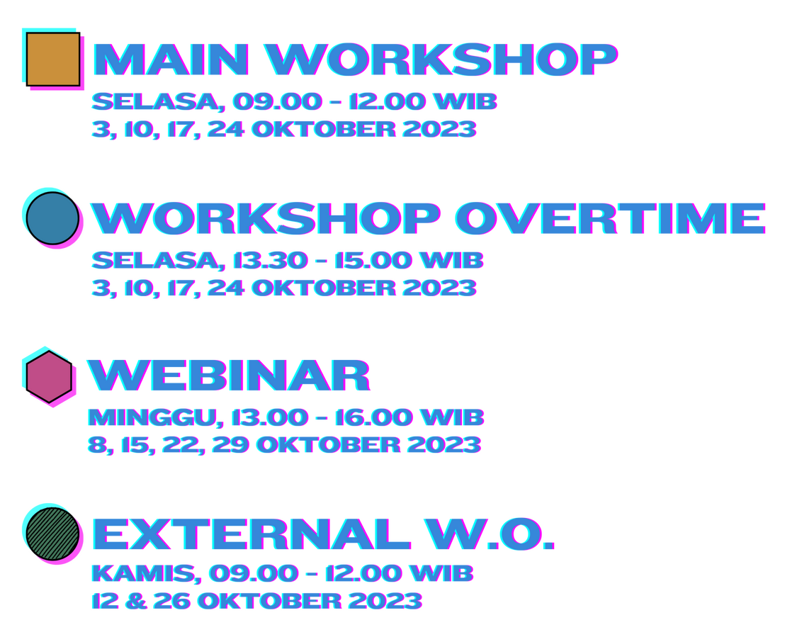 Kegiatan FEIDLAMBDA 2023 dibagi menjadi dua kegiatan utama yaitu WORKSHOP dan WEBINAR. Saat ini, kegiatan WORKSHOP ditujukan bagi peserta yang hadir tatap muka dan tertutup undangannya. Akan tetapi, peserta lain yang tertarik dengan kegiatan WORKSHOP bisa mengikuti dan menyimaknya melalui online dengan mendaftarkan diri ke link yang telah disediakan.Jika kebingungan dengan jumlah kegiatannya dan kegiatan manakah yang harus dihadiri, bisa cukup mengikuti kegiatan WEBINAR yang diadakan setiap hari Minggu, Jam 13.00 - 16.00 WIB. Kegiatan tersebut dirancang bagi peserta yang cukup penasaran dengan fitur-fitur baru di excel dan akan fokus pada penyampaian materi dibandingkan penguasaan materi.